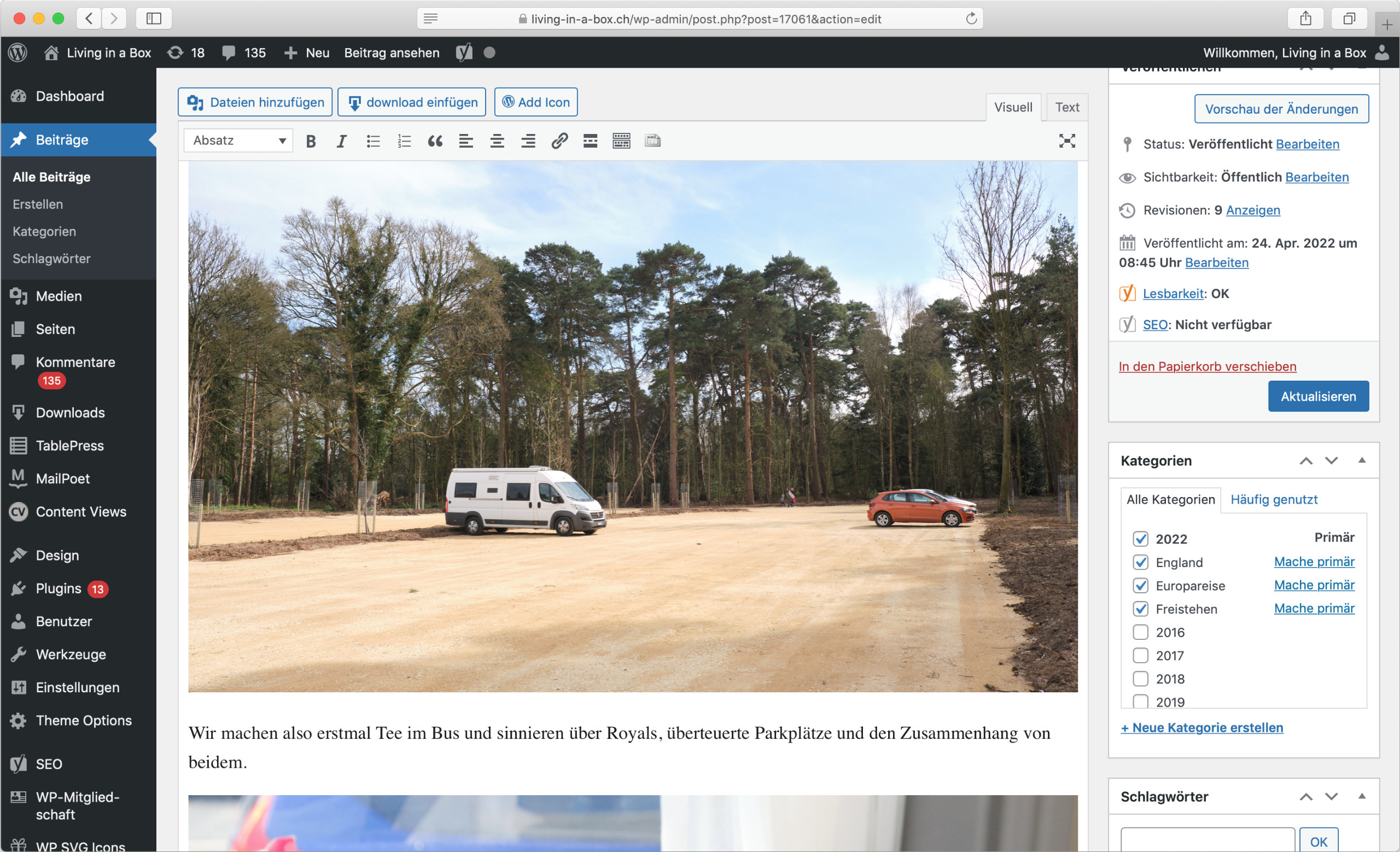 Das Erstellen eines Reiseberichts dauert zwischen 10 und 25 Stunden. Das beinhaltet lediglich Bildauswahl, Bildbearbeitung/Optimierung, Text, Korrekturlesen, Zusammenstellung und Veröffentlichung in WordPress (Routenplanung, Recherche und Fotografie nicht eingerechnet). Mittlerweile sind über 300 Reiseberichte mit über 11000 Bildern entstanden. Living in a Box wird allmählich zum Lebenswerk.